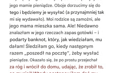Kłamstwo ukryte w dwudziestodolarowych banknotach Kiedy Tatiana odkryła kłamstwo ukryte w pliku banknotów , wszystko, w co wierzyła na temat swojego małżeństwa , zaczęło się rozpadać . Zdrada nie wybuchła krzykiem ani dramatem . Narastała cicho , skrywana w drobnych kłamstwach i grzecznych uśmiechach – aż prawda w końcu wypłynęła na światło dzienne . To opowieść o godności , rodzinie i cenie zaufania . Małżeństwo z cichymi obowiązkami Kiedy wyszłam za mąż za Craiga , wiedziałam , że nie tylko zyskuję męża . Wkraczam w skomplikowaną więź między synem a jego matką . Eleanor była łagodną , dumną kobietą . Wcześnie owdowiała i mieszkała sama w skromnym , jednopokojowym mieszkaniu w sąsiednim mieście . Nigdy się nie skarżyła i nigdy nie prosiła o pomoc . Ale Craig martwił się o nią. Z drugiej strony , moja rodzina miała szczęście . Moi rodzice zbudowali wygodne życie dzięki mądrym inwestycjom i dobremu wyczuciu czasu . Zapłacili nawet za nasz ślub i rozpieszczali naszego psa , Pradę, comiesięcznymi pudełkami z zabawkami . Craig zwykł żartować , że mam „ złoty dotyk ”. Wtedy myślałam , że mówił to z miłością . Po około roku małżeństwa Craig coś zasugerował . „ Jesteś pewna , Tatiano?” zapytał pewnego wieczoru . „ Jeśli zaczniemy , będziemy musieli to robić … prawdopodobnie w nieskończoność ” . Umówiliśmy się , że…