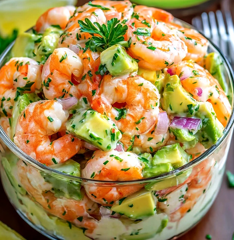Kremowa sałatka z krewetkami i awokado to lekki, aromatyczny i szybki w przygotowaniu przepis. Ta zdrowa sałatka z krewetkami i awokado łączy w sobie słodycz dojrzałych awokado, delikatność krewetek i gładki sos cytrynowo-jogurtowy, tworząc zbilansowane i orzeźwiające danie.