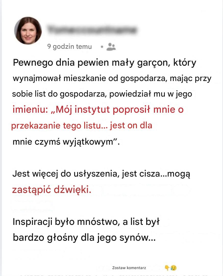 Pewnego dnia mały chłopiec wrócił ze szkoły z listem w ręku, który wręczył swojej mamie, mówiąc: „Mój nauczyciel poprosił mnie, abym przekazał ci ten list... ale tylko tobie”.